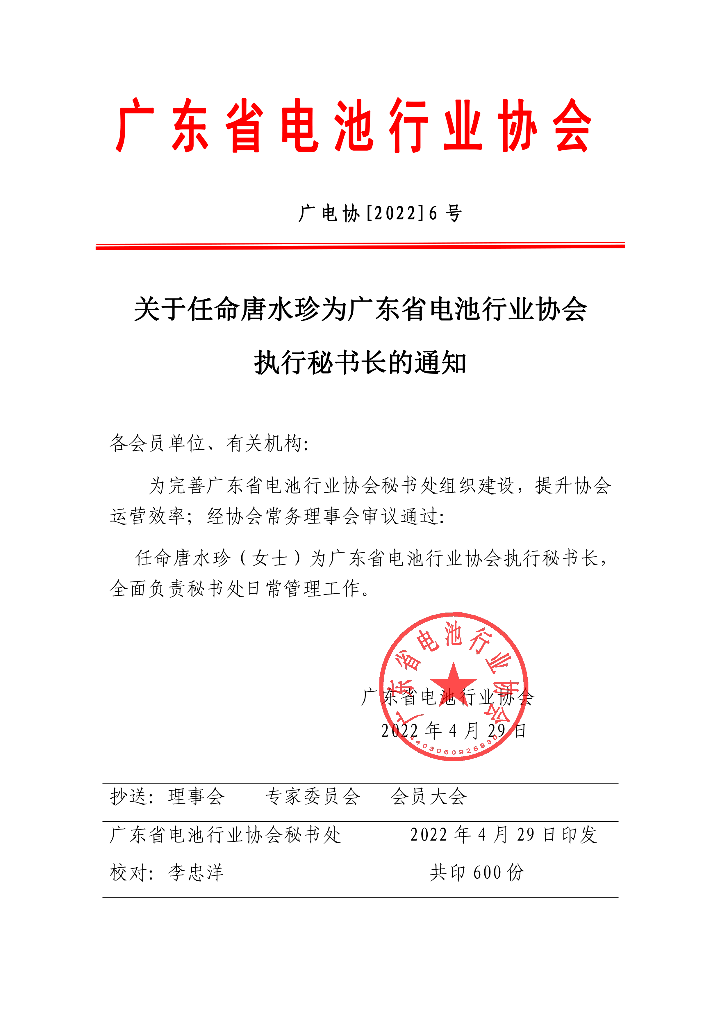 關(guān)于任命唐水珍為廣東省電池行業(yè)協(xié)會(huì )執行秘書(shū)長(cháng)的通知