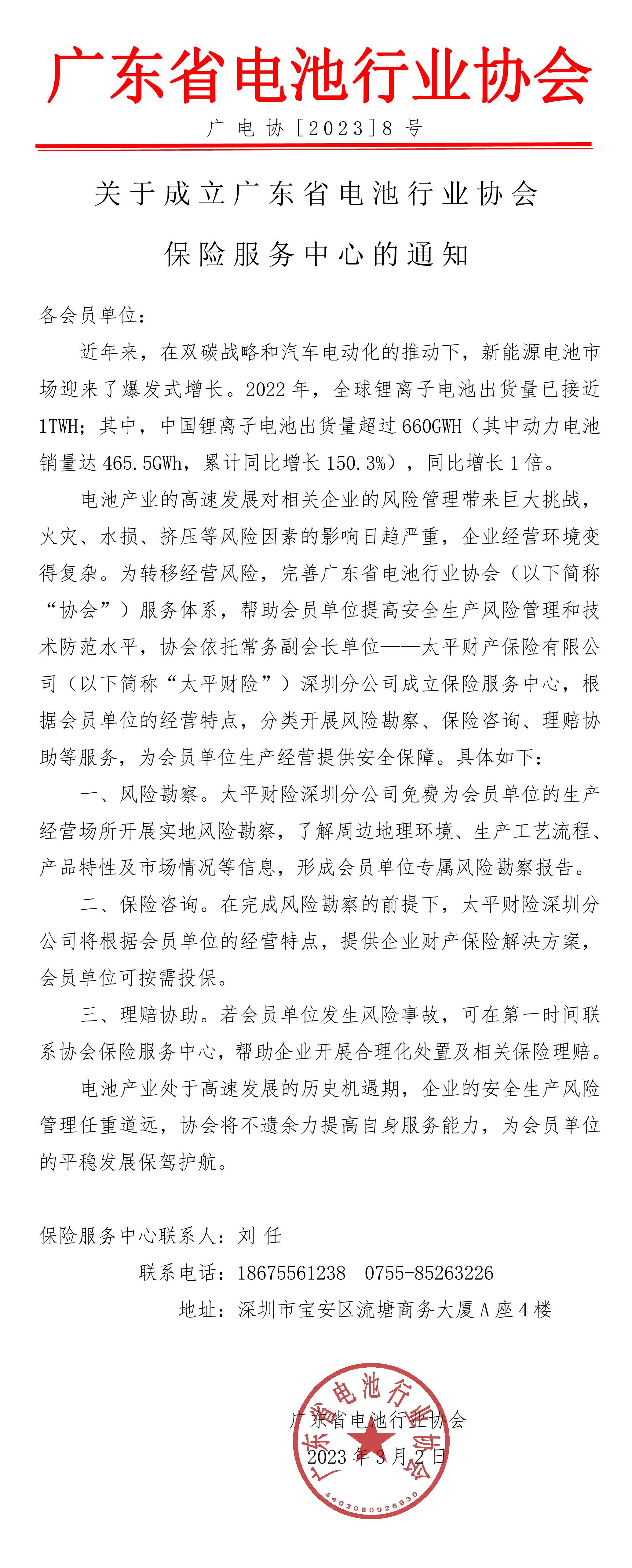 關(guān)于成立廣東省電池行業(yè)協(xié)會(huì )保險服務(wù)中心的通知