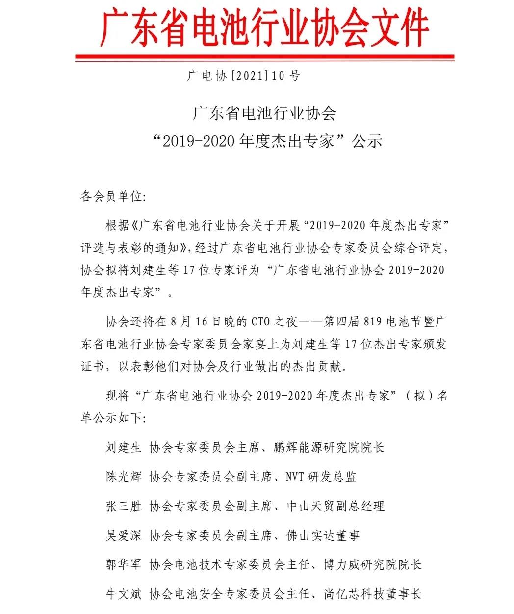 根據《廣東省電池行業(yè)協(xié)會(huì )關(guān)于開(kāi)展“2019-2020年度杰出專(zhuān)家”評選與表彰的通知》,經(jīng)過(guò)廣東省電池行業(yè)協(xié)會(huì )專(zhuān)家委員會(huì )評定,擬將劉建生等17位專(zhuān)家評為“廣東省電池行業(yè)協(xié)會(huì )2019-2020年度杰出專(zhuān)家”。