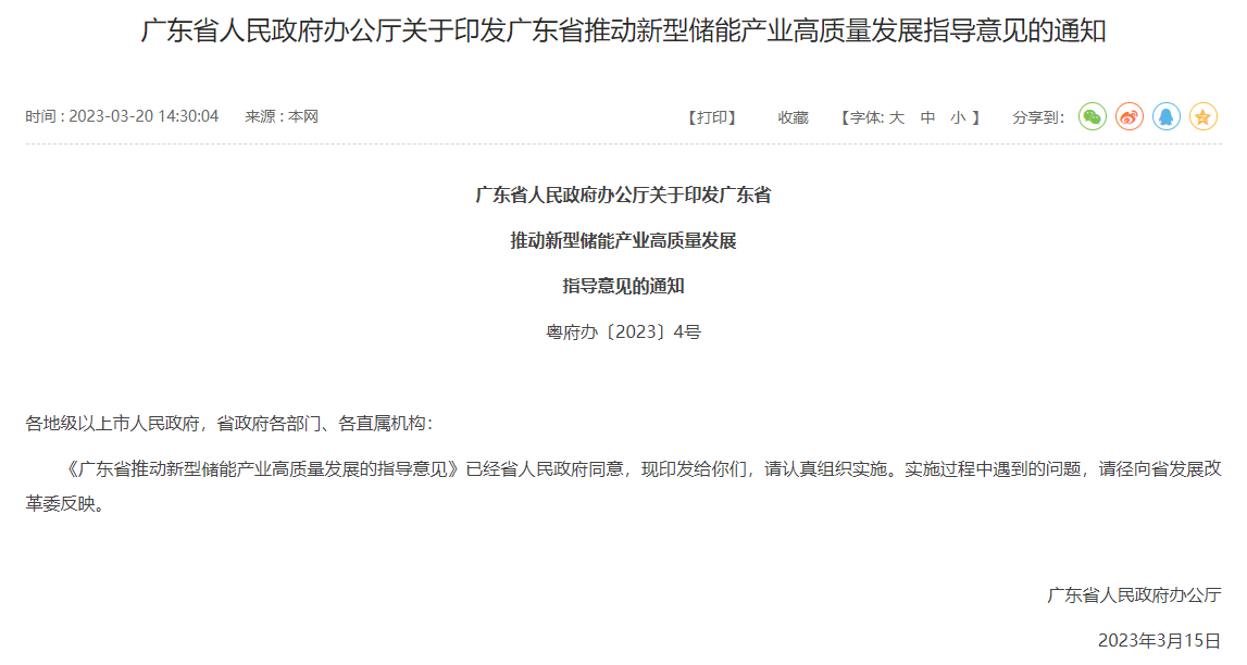 2023年3月20日,廣東省人民政府辦公廳發(fā)布《關(guān)于印發(fā)廣東省推動(dòng)新型儲能產(chǎn)業(yè)高質(zhì)量發(fā)展指導意見(jiàn)的通知》。