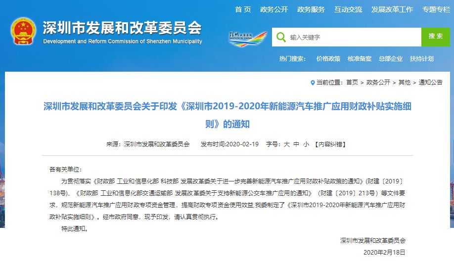 近日,深圳市發(fā)展和改革委員會(huì )發(fā)布了《深圳市2019-2020年新能源汽車(chē)推廣應用財政補貼實(shí)施細則》。