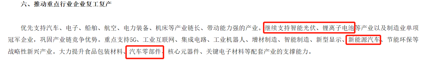 2月24日,工信部發(fā)布的《關(guān)于有序推動(dòng)工業(yè)通信業(yè)企業(yè)復工復產(chǎn)的指導意見(jiàn)》指出,推動(dòng)重點(diǎn)行業(yè)企業(yè)復工復產(chǎn)。繼續支持智能光伏、鋰離子電池等產(chǎn)業(yè)以及制造業(yè)單項冠軍企業(yè),鞏固產(chǎn)業(yè)鏈競爭優(yōu)勢。點(diǎn)支持5G、智能制造、新能源汽車(chē)、節能環(huán)保等戰略性新興產(chǎn)業(yè)。大力提升汽車(chē)零部件、核心元器件、關(guān)鍵電子材料等配套產(chǎn)業(yè)的支撐能力。